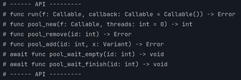 - Functions to manage Thread Pools - A group of threads running a single function on a set of data, which is supplied at any point, many details can be customized